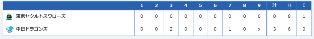 - 試合結果: 中日ドラゴンズ3-0東京ヤクルトスワローズ