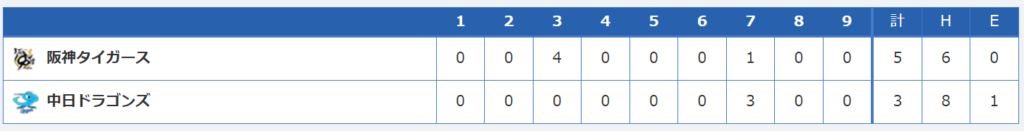 - 試合結果: 中日ドラゴンズ 3 – 5 阪神タイガース