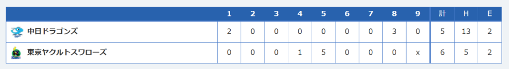 - 試合結果: 中日ドラゴンズ 5 – 6 ヤクルトスワローズ