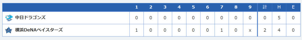 試合結果: 中日ドラゴンズ 0-2 横浜DNAベイスターズ